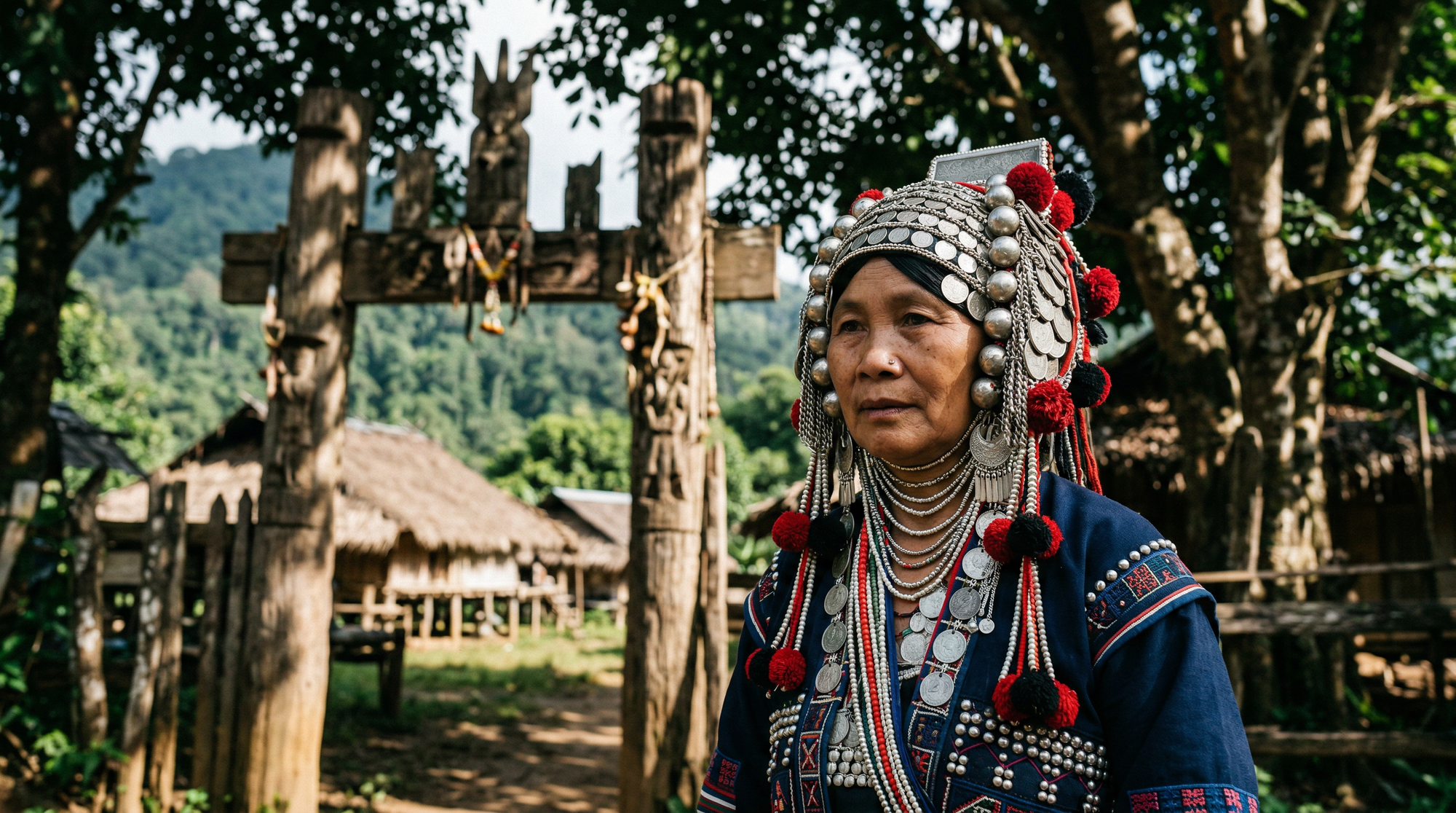 Akha villages are immediately identifiable by two features. The first is the elaborate silver headdresses worn by women, heavy constructions of coins, beads, and worked silver that are among the most visually striking expressions of personal identity in all of highland Southeast Asia. Traditional Akha dress is vibrant and intricate, reflecting cultural identity and social status. Women wear elaborately embroidered jackets, skirts, decorated sashes, and headdresses adorned with silver ornaments.